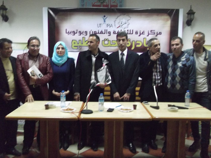 وفي ختام اللقاء تم دعوة يسري درويش رئيس الاتحاد العام للمراكز الثقافية وأشرف سحويل رئيس مجلس إدارة مركز غزة للثقافة والفنون ليقدما بدورهم درع مركز غزة ويتوبيا للشاعر الشاب/ طلال بدوان تقديراً لمشاركته ضمن فعاليات مبادرة تحت الطبع.