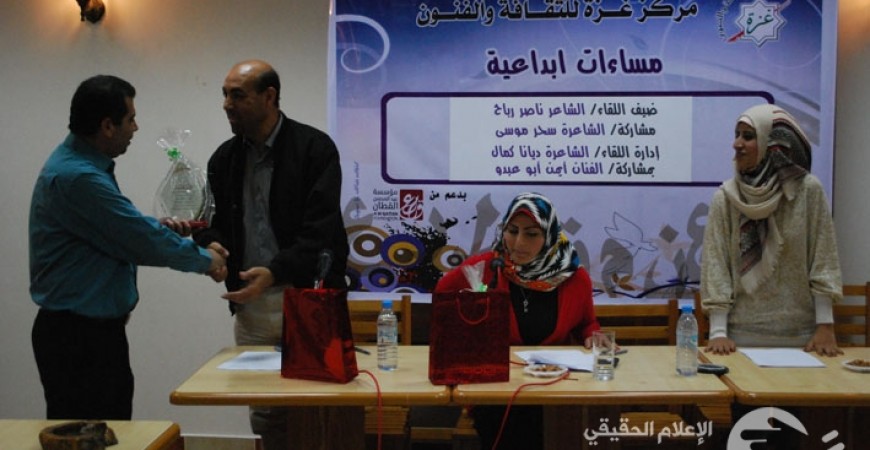 نظم مركز غزة للثقافة والفنون ،مساء اليوم الثلاثاء،5مايو2015 أمسية شعرية بعنوان " مساء ال غير" ضمن مبادرة مساءات إبداعية بدعم وتمويل من برنامج الثقافة والفنون بمؤسسة عبد المحسن القطان بحضور ضيف اللقاء الشاعر ناصر رباح والشاعرة الشابة/ سحر موسى وأدار اللقاء الشاعرة الشابة/ديانا كمال، حشد كبير من نخبة المثقفين والمبدعين والأدباء والكتاب. وفي ختام الأمسية قدم أشرف سحويل رئيس مجلس إدارة مركز غزة للثقافة والفنون درع المركز تكريماً للشاعر/ناصر رباح والشاعرة سحر موسى.