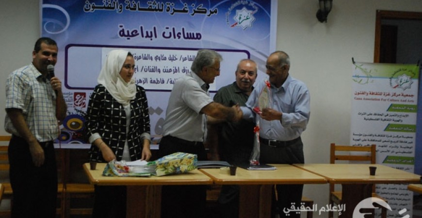 وفي ختام الأمسية تم دعوة الروائي الكبير غريب عسقلاني رئيس الاتحاد العام للكتاب والادباء في غزة لتقديم درع المركز للمشاركين تكريماً للشاعر/خليل مكاوي والشاعرة/هيا عبد الرحمن أبو نصر،والكاتب رزق المزعنن.
